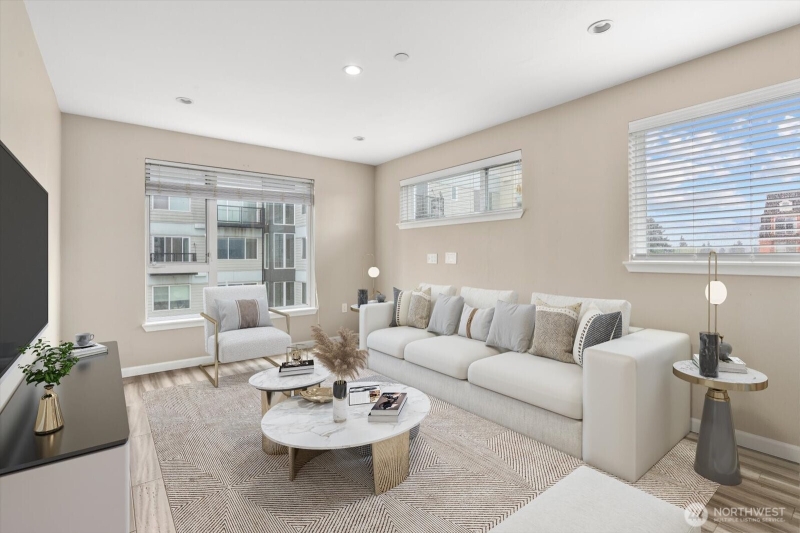 Bright, corner condo at The Luminaire --Steps from restaurants , breweries , parks and the farmers market. Very nice airy, light-filled living space ,new flooring ,and a sleek kitchen with stainless appliances and breakfast bar, Spacious walk-in closet , in-unit washer/dryer, secure lobby, and TWO assigned garage spaces .HOA covers water, sewer, garbage and central hot water , no rental cap ! Walk score of 91. Quick access to I-5, Lake City Way/Bothell Way access for easy commute .